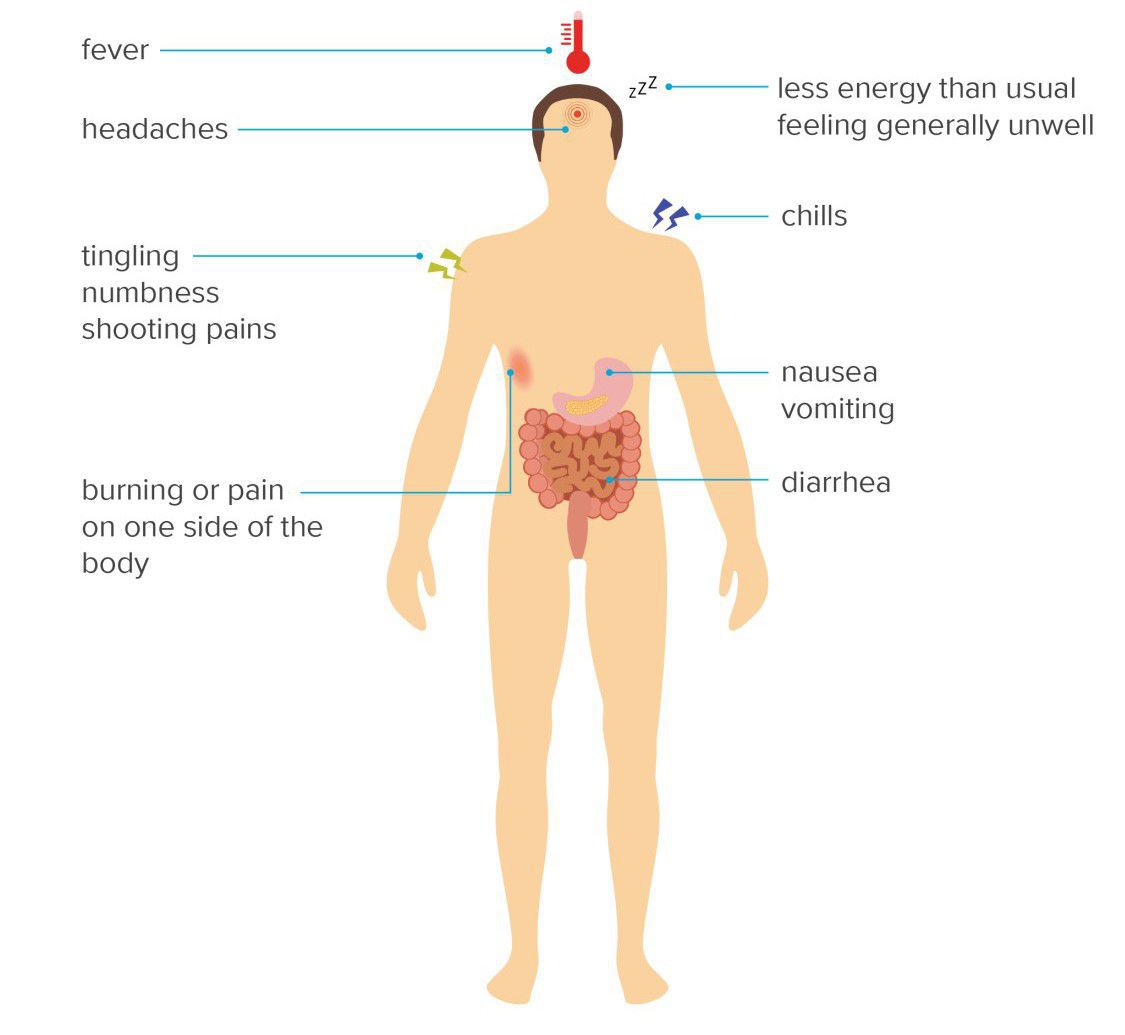 Signs & Symptoms Shingles is a painful rash that develops on one side of the face or body. The rash consists of blisters that typically scab over in 7 to 10 days and fully clears up within 2 to 4 weeks. Before the rash appears, people often have pain, itching, or tingling in the area where it will develop.