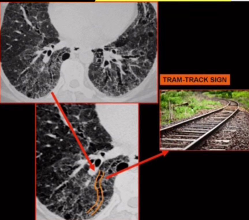 Tram-track sign may be used in chest radiography or CT to denote the thickened non-tapering (parallel) walls of cylindrical bronchiectasis. It should not be confused with other tram-track signs elsewhere in the body.