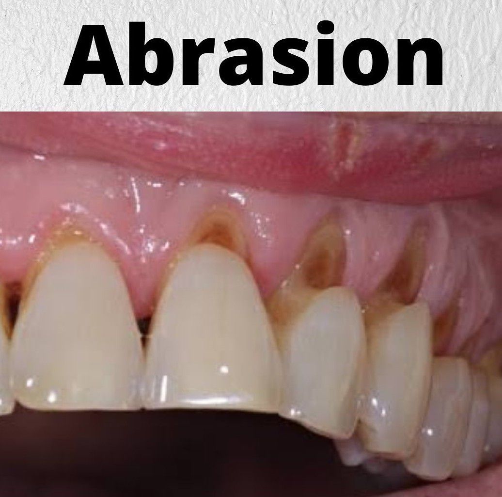 Dental abrasion occurs when your tooth's surface has suffered an abnormal amount of wearing down from some external force and begins to lose enamel. It typically shows up as a v-shaped nick present on the bottom of your tooth, over time.