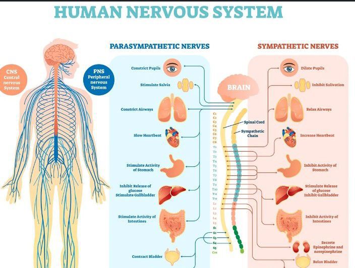 What Is the Nervous System? The nervous system includes the brain, spinal cord, and a complex network of nerves. This system sends messages back and forth between the brain and the body. The brain is what controls all the body's functions. The spinal cord runs from the brain down through the back.