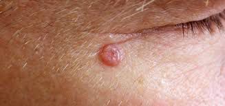 Symptoms Basal cell carcinoma usually develops on sun-exposed parts of your body, especially your head and neck. Less often, basal cell carcinoma can develop on parts of your body usually protected from the sun, such as the genitals. Basal cell carcinoma appears as a change in the skin, such as a growth or a sore that won't heal. These changes in the skin (lesions) usually have one of the following characteristics: A shiny, skin-colored bump that's translucent, meaning you can see a bit through the surface. The bump can look pearly white or pink on white skin. On brown and Black skin, the bump often looks brown or glossy black. Tiny blood vessels might be visible, though they may be difficult to see on brown and Black skin. The bump may bleed and scab over. A brown, black or blue lesion — or a lesion with dark spots — with a slightly raised, translucent border. A flat, scaly patch with a raised edge. Over time, these patches can grow quite large. A white, waxy, scar-like lesion without a clearly defined border.