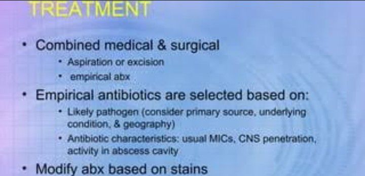 A brain abscess is usually treated using a combination of: medicines – either antibiotics or antifungals. surgery – either draining the pus through a hole in the skull (simple aspiration) or opening the skull and removing the abscess entirely (craniotomy)