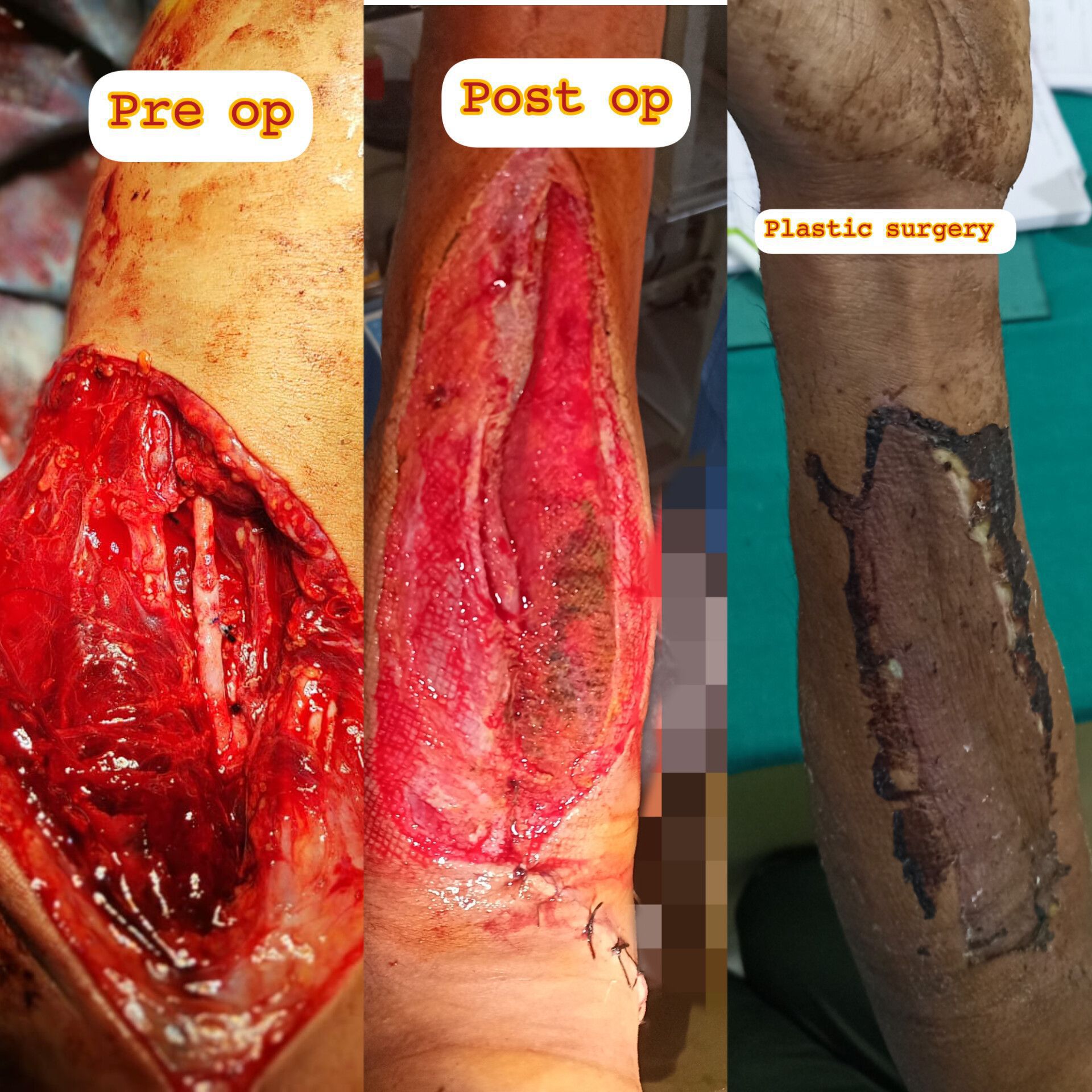 Exploration with end to end brachial artery anastomosis With median nerve repair. FOREARM FASCIOTOMY DONE..