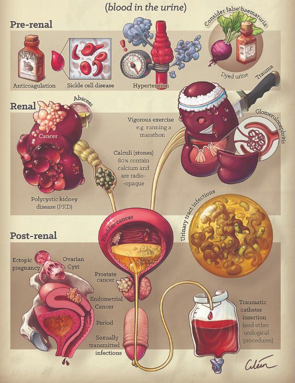 This condition happens when the kidneys or other parts of the urinary tract let blood cells leak into urine. Different problems can cause this leaking to happen, including: Urinary tract infections (UTIs). These happen when bacteria get into the tube through which urine leaves the body, called the urethra.
