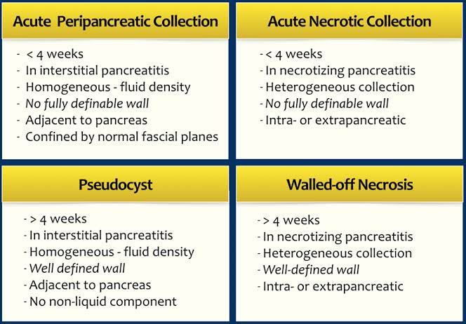 Radiology of acute pancreatitis shows 4 distinct types.