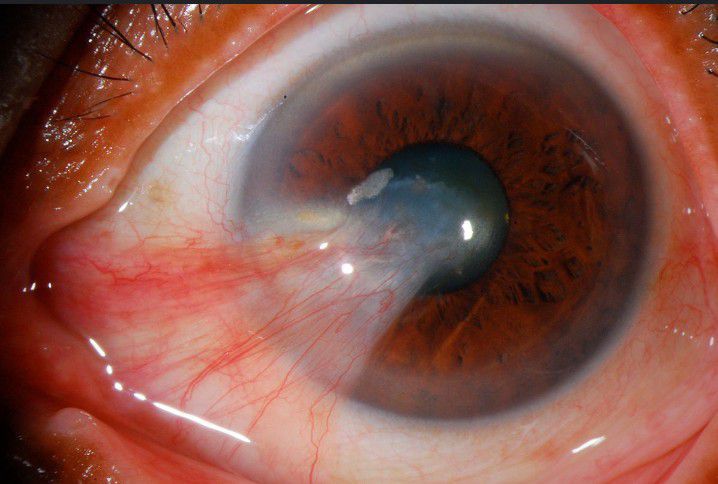 A pterygium is a fleshy overgrowth of the conjunctiva that may affect one or both eyes. Risk factors include excessive exposure to sunlight in people who spend time outdoors, and chronic eye irritation.