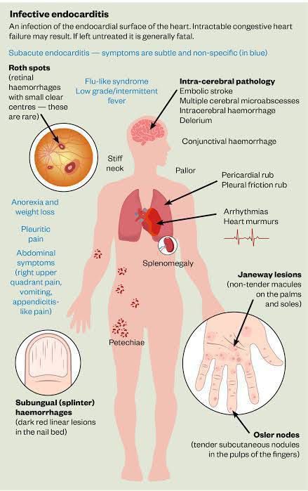 Signs of an endocarditis infection include: Fever above 100°F (38.4°C). Sweats or chills, particularly night sweats. Skin rash. Pain, tenderness, redness or swelling. Wound or cut that won't heal. Red, warm or draining sore. Sore throat, scratchy throat or pain when swallowing. Sinus drainage, nasal congestion, headaches or tenderness along your upper cheekbones. Persistent dry or a moist cough that lasts more than two days. White patches in your mouth or on your tongue. Nausea, vomiting or diarrhea. Emboli (small blood clots), hemorrhages (internal bleeding) or stroke. Shortness of breath. Poor appetite or weight loss. Muscle and joint aches.