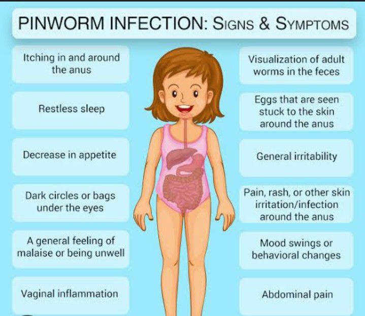 Enterobiasis (called pinworm infection or oxyuriasis) causes itching around the anus which can lead to difficulty sleeping and restlessness. Symptoms are caused by the female pinworm laying her eggs. Symptoms of pinworm infection usually are mild and some infected people have no symptoms.