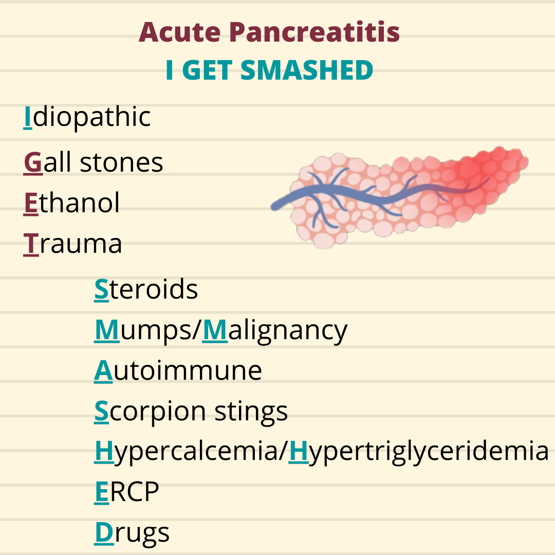 Pancreatitis is a medical condition describing inflammation of the pancreas. Pancreatitis can be either acute or chronic. Acute pancreatitis is typically caused by the over-activation of pancreatic enzymes, which can be due to either pancreatic acinar damage or outflow tract obstruction. "I GET SMASHED" is a mnemonic device used to help recall the causes of acute pancreatitis.