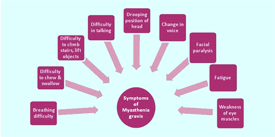 The following symptoms are commonly associated with myasthenia gravis: Weakness of the eye muscles (ocular myasthenia) Drooping of one or both eyelids (ptosis) Blurred or double vision (diplopia) Changes in facial expressions. Difficulty swallowing. Shortness of breath. Impaired speech (dysarthria)