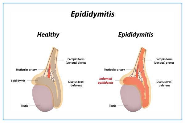 Symptoms of epididymitis might include: A swollen, discolored or warm scrotum Testicle pain and tenderness, usually on one side, that often comes on slowly Pain when you pass urine An urgent or frequent need to urinate Discharge from the penis Pain or discomfort in the lower abdomen or pelvic area Blood in the semen Less commonly, fever
