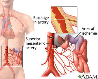 Acute mesenteric ischemia Signs and symptoms of the acute form of mesenteric ischemia include: Abrupt, severe abdominal pain Urgent need to have a bowel movement Fever Nausea and vomiting Chronic mesenteric ischemia Signs and symptoms of the chronic form of mesenteric ischemia include: Abdominal pain that starts about 30 minutes after eating Pain that worsens over an hour Pain that goes away within one to three hours