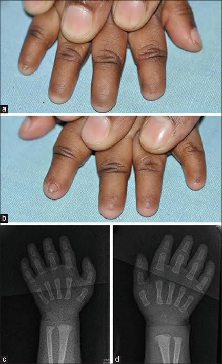 (a and b) The first patient showing brachydactyly, rudimentary nails of digits 2, 3, 5 of the right hand and digit 5 of the left hand with absence of nails of digit 4 of the right hand and digits 3 and 4 of the left hand. (c and d) Plain radiograph of both the hands showing the absence of distal phalanges of digits 2–5