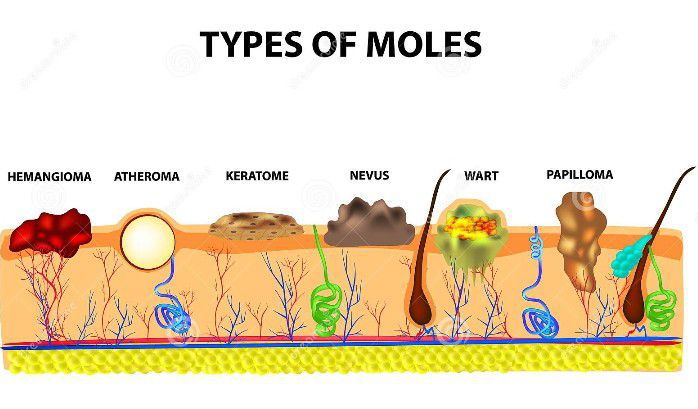 There are 4 common types of moles: congenital moles, dysplastic nevi, acquired nevi, and spitz nevi. Below are the differences between each.