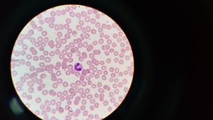 Eosinophils have bright pink granules that release histamine and have a bi-lobed nucleus