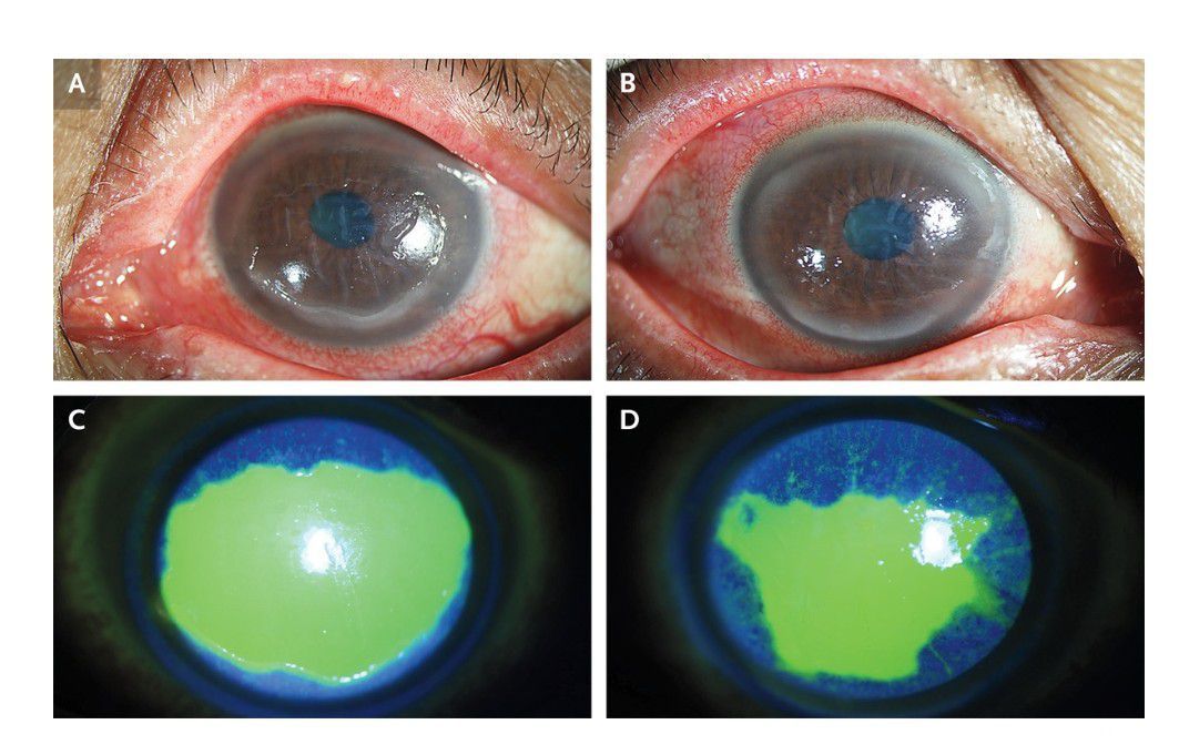 A 64-year-old woman presented to the rheumatology clinic with a 5-month history of photophobia with ocular pain and a foreign-body sensation in both eyes. On further questioning, the patient reported that she had had dry eyes and dry mouth for approximately 20 years without a specific diagnosis or treatment. The visual acuity was 20/25 in each eye, and slit-lamp examination showed conjunctival hyperemia, corneal epithelial erosions, and corneal endothelial folds consistent with keratoconjunctivitis sicca in both eyes (Panels A and B). The corneal lesions were further visualized with fluorescence staining (Panels C and D [green areas]). Schirmer testing showed reduced aqueous tear production, and serologic testing showed an antinuclear antibody titer of 1:160, with antibody positivity for the extractable nuclear Sjögren’s syndrome–related antigen A (Ro52) as well as an elevated rheumatoid factor of 66 IU per milliliter (reference value, <20 IU per milliliter). A diagnosis of Sjögren’s syndrome was made, and treatment for the ocular symptoms included topical cyclosporine A and artificial tears. The symptoms resolved after 2 months.