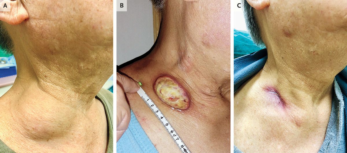 A 66-year-old man presented to the outpatient clinic with a 1-month history of a progressively enlarging mass on the lower right side of the neck (Panel A). He otherwise felt well. His temperature was 37.0°C, and he did not appear to be cachectic. On examination, the neck mass was soft and nontender, and it measured 5.5 cm at the largest dimension. A chest radiograph showed no lung lesions. Findings on a computed tomographic scan of the neck and chest showed multiple, enlarged lymph nodes with peripheral enhancement extending from the lower right side of the neck to the mediastinum. Fine-needle aspiration of the neck mass was performed. Acid-fast bacilli were observed on microscopic examination, and culture grew Mycobacterium tuberculosis, which was sensitive to first-line antituberculous treatment. Test results for the human immunodeficiency virus were negative. A diagnosis of mycobacterial cervical lymphadenitis, or scrofula, was made. Treatment with rifampin, isoniazid, pyrazinamide, and ethambutol was initiated. The neck mass showed a paradoxical reaction, with drainage, during the first 3 months of treatment (Panel B, day 84 of treatment), but with wound care the neck mass gradually resolved over 5 months (Panel C, day 156 of treatment). The patient completed a 9-month course of treatment, and at follow-up 3 months after treatment was completed, he was well, without disease recurrence.