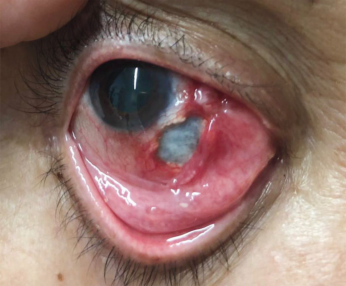 A 73-year-old woman with a history of seropositive erosive rheumatoid arthritis presented to the emergency department with a 1-month history of pain in her right eye. Four years before presentation, she had stopped her immunosuppressive treatment and switched to homeopathic therapies. The visual acuity was 20/25 in the affected eye. Slit-lamp examination showed hyperemia, inflammation, and marked scleral thinning with exposure of the underlying choroid. Laboratory studies showed an elevated level of rheumatoid factor, an increased erythrocyte sedimentation rate, and negative results on testing for antineutrophil cytoplasmic antibodies. A diagnosis of necrotizing anterior scleritis with inflammation was made. Treatment with intravenous glucocorticoids and cyclophosphamide was initiated, and the patient underwent surgical repair with a scleral graft and amniotic membrane transplantation. The patient also received a conjunctival autograft from the same eye. She completed a tapered course of an oral glucocorticoid, and immunosuppressive therapy was switched to oral methotrexate. At the follow-up visit 3 months after surgery, the ocular inflammation and pain had resolved and the patient’s vision was preserved.