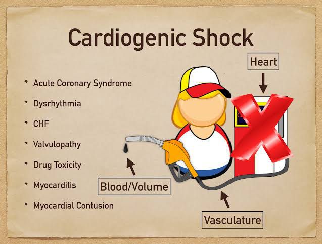 Cardiogenic shock signs and symptoms include: Rapid breathing Severe shortness of breath Sudden, rapid heartbeat (tachycardia) Loss of consciousness Weak pulse Low blood pressure (hypotension) Sweating Pale skin Cold hands or feet Urinating less than normal or not at all