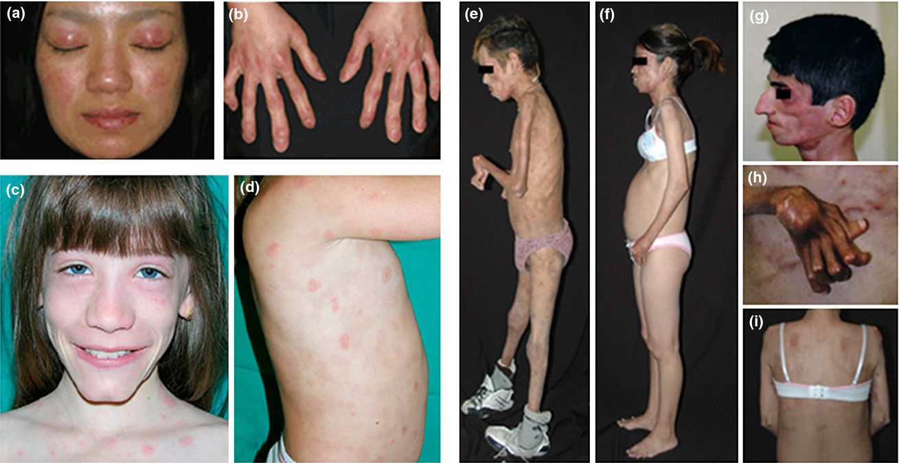 Here are some of the most common signs and symptoms: Joint pain. Developmental delays. Recurrent fevers. Purpura. Swollen eyelids. Progressive lipodystrophy (fat loss). Contractures. Seizures.