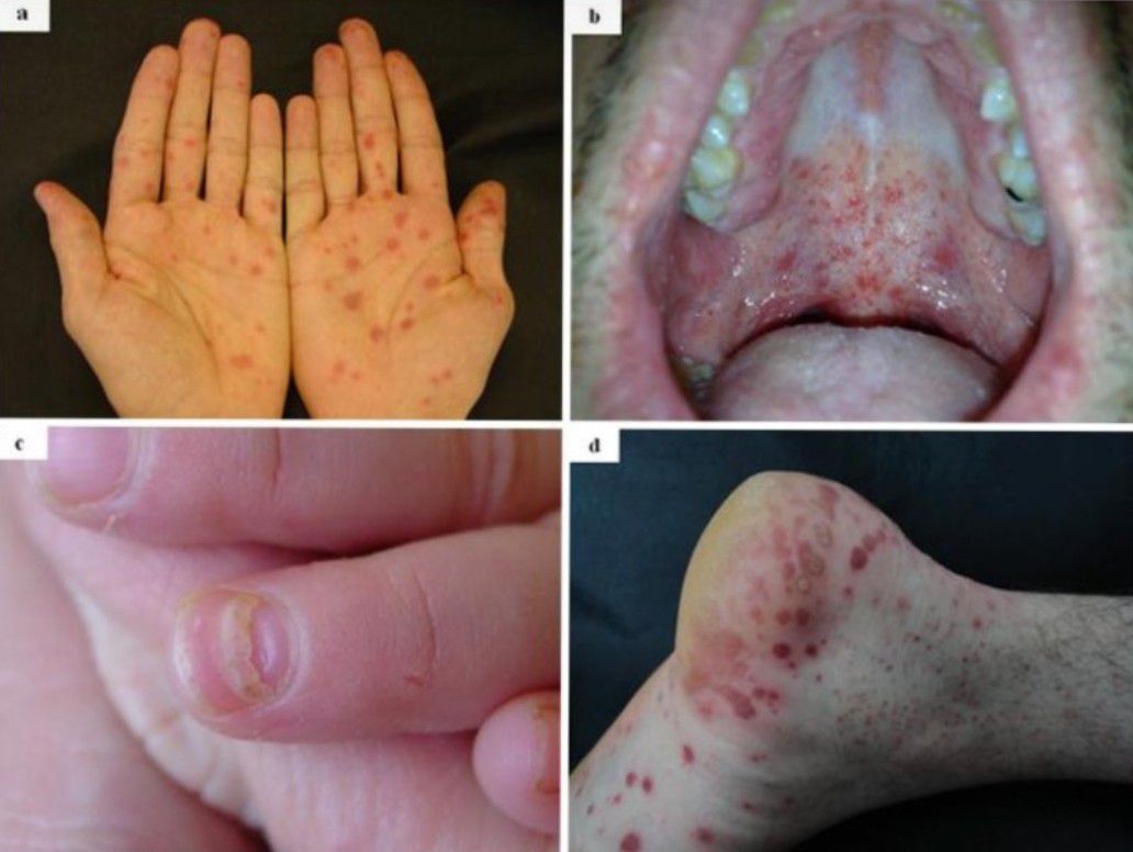 Hand-foot-and-mouth disease with onychomadesis (separation of nail plate) looks like in an adult. The nail finding is a possible late complication of HFMD and can be remembered by noting that the rash can desquamate as well