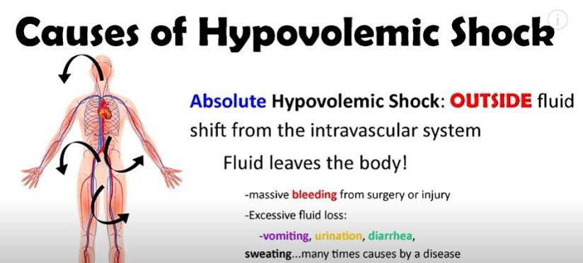 hypovolemic shock. You may be bleeding a lot inside your body, where you can’t see it, or outside your body, where you can see an obvious injury. You can also get hypovolemic shock from burns, pancreatitis, or from too much sweating, throwing up or diarrhea. Types of bleeding that lead to hypovolemic shock include bleeding from: A traumatic injury. Surgery. Ectopic pregnancy. An aneurysm that has burst. Gastrointestinal problems, such as an ulcer.