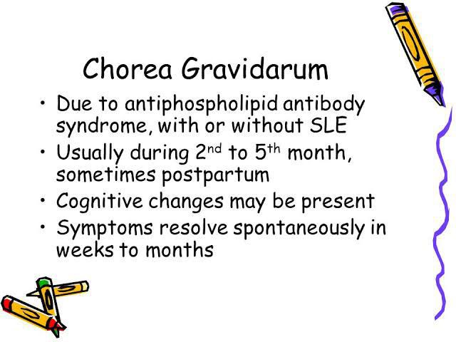 Chorea gravidarum is an uncommon condition characterized by involuntary movements, speaking alterations and in the affective status during first trimester pregnancy, the incidence is 1 by each 2275 pregnancies, it is self limiting and resolves when the pregnancy ends, most of the cases are idiopathic and the rest is associated to the antiphospholipid syndrome, rheumatic fever, thyrotoxicosis, systemic lupus erythematosus, syphilis, Huntington disease or induced by drugs.