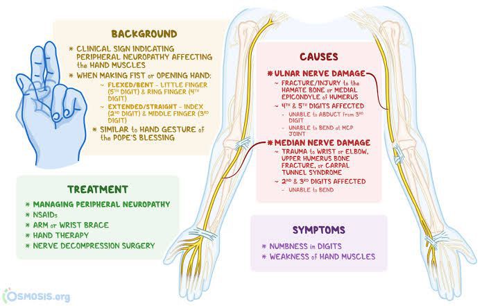 Hand of benediction (AKA preacher’s hand) is a clinical sign indicating peripheral neuropathy, or damage of the nerves outside the brain and spinal cord, specifically those affecting the muscles of the hand. It is seen under certain conditions when a person is asked to make a fist or open their hand, resulting in the little finger (5th digit) and ring finger (4th digit) remain flexed or bent, while the index (2nd digit) and middle finger (3rd digit) are extended. This resembles the hand gesture of the pope giving their blessing (a papal benediction), lending to the name hand of benediction.