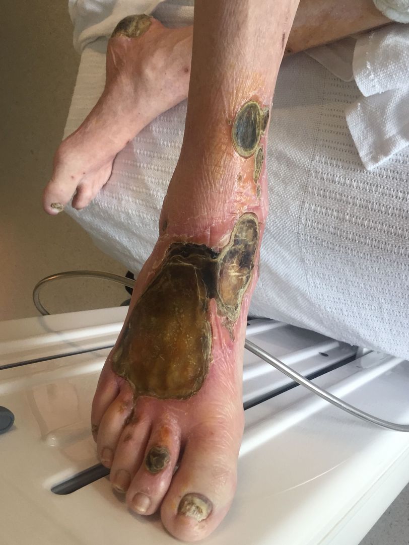 Pt had not removed his socks in over 3 months, he also had diabetes that was not managed well which resulted in these ulcers. The patient had bilateral amputations mid tibia/fibula.