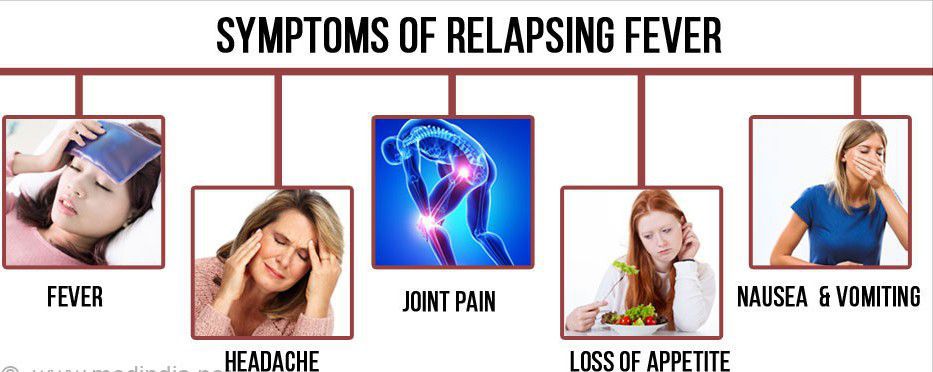 Symptoms of relapsing fever include: Bleeding. Coma. Headache. Joint aches, muscle aches. Nausea and vomiting. Sagging on one side of the face (facial droop) Stiff neck. Sudden high fever, shaking chills, seizure.