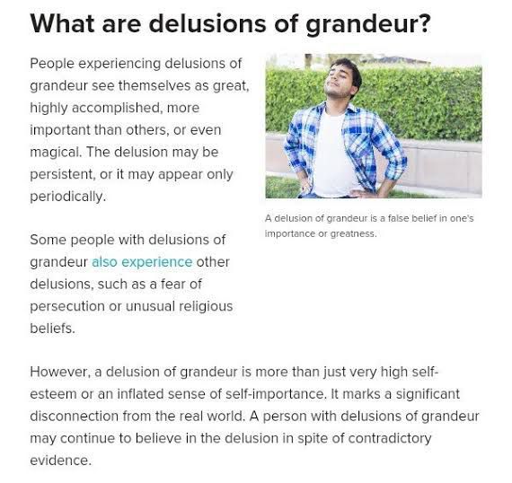 Delusions of grandeur are one of the more common ones. It's when you believe that you have more power, wealth, smarts, or other grand traits than is true. Some people mistakenly call it “illusions” of grandeur.