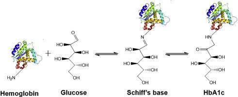 Glycated hemoglobin (HbA1c) is a laboratory test used to assess long-term blood glucose control in patients with diabetes mellitus. HbA1c is a form of hemoglobin that is formed when red blood cells bind to glucose and remains in the blood for a longer period of time than nonglycated hemoglobin, thus providing a measure of the average blood glucose level over the past 8-12 weeks. The bond that is formed between hemoglobin and glucose leads to the formation of a schiff base, which causes molecular rearrangements that produce AGEs, or advanced glycation products that can trigger inflammatory processes and lead in the long run to atherosclerotic diseases. HbA1c is expressed as a percentage, and the goal of treatment for diabetes mellitus is to keep HbA1c below 7 percent, which indicates an average blood glucose level over the past 8 to 12 weeks of less than 154 mg/dL.However, there are some situations in which the HbA1c test may be unreliable, such as in the case of people with sickle cell anemia or other forms of abnormal hemoglobin, who may have falsely low or falsely high results. In addition, patients with chronic kidney disease or type 1 diabetes may have reduced hemoglobin half-life and thus falsely low results.