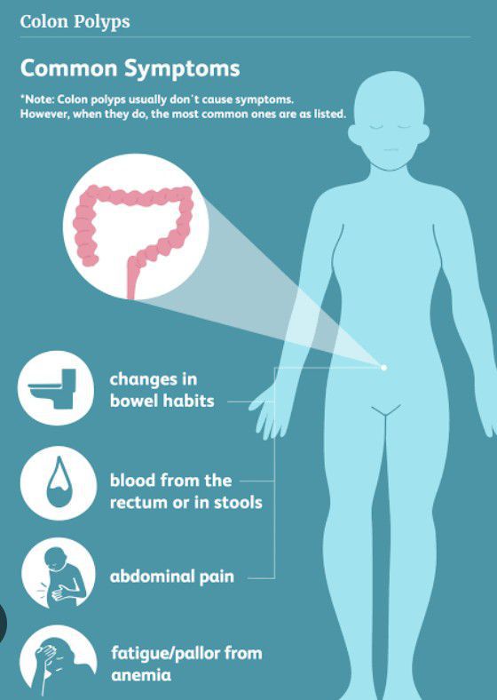 Symptoms Change in bowel habits. Constipation or diarrhea that lasts longer than a week may mean the presence of a larger colon polyp or cancer. ... Change in stool color. Blood can show up as red streaks in your stool or make stool appear black. Iron deficiency anemia. Pain. Rectal bleeding