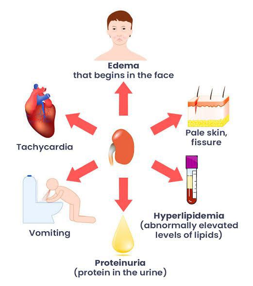 Common nephrotic syndrome symptoms include: Large amounts (greater than 3.5 grams) of the protein albumin in your pee (albuminuria). High fat and cholesterol levels in your blood (hyperlipidemia). Swelling (edema), usually in your legs, feet or ankles. Swelling may also occur in your hands or face. Low levels of albumin in your blood (hypoalbuminemia). Loss of appetite. Feeling unwell or sick. Abdominal pain (pain anywhere from your ribs to your pelvis). Foamy pee.