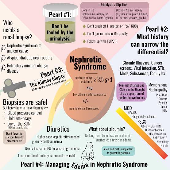 Kidney diseases often damage your glomeruli. The diseases target your glomeruli, though healthcare providers and medical researchers aren’t sure why. Damaged glomeruli are the primary cause of nephrotic syndrome. These diseases include: Amyloidosis. This is a disease in which amyloid proteins build up in your vital organs. Amyloidosis most commonly occurs in your kidneys, affecting their ability to filter. Diabetes-related nephropathy. “Nephropathy” means that your kidney isn’t working properly. In diabetes-related nephropathy, diabetes causes damage or dysfunction to one or more of the nerves in your kidneys. It typically causes numbness, tingling, muscle weakness and pain in your affected area. Focal segmental glomerulosclerosis (FSGS). In FSGS, scarring affects small areas (segments) of some of your glomeruli. It may cause swelling, kidney failure and loss of proteins in your pee. Lupus. Lupus is an autoimmune disease that causes inflammation, swelling and pain throughout your body, including your kidneys. Membranous nephropathy. In membranous nephropathy, your body’s immune system attacks the filtering membranes in your kidneys. Minimal change disease (MCD). This is a type of nephropathy in which your kidneys aren’t working properly. However, a kidney biopsy shows little or no damage to your glomeruli or kidney tissue. MCD may occur at any age, but it’s most common in children.