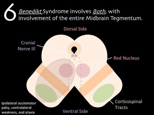 The symptoms are: left-sided ptosis, adduction weakness, mydriasis, right arm choreoathetosis and right leg weakness with resting tremor.