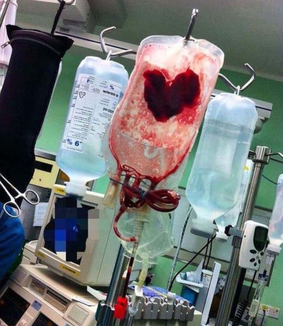 This heart-shaped blood clot formed after the blood tranfusion was stopped and the bag detached. Blood transfusion is the process of transferring blood products into one's circulation intravenously. Transfusions are used for various medical conditions to replace lost components of the blood. Early transfusions used whole blood, but modern medical practice commonly uses only components of the blood, such as red blood cells, white blood cells, plasma, clotting factors, and platelets. Red blood cells (RBC) contain hemoglobin, and supply the cells of the body with oxygen. White blood cells are not commonly used during transfusion, but are part of the immune system, and fight infections. Plasma is the "yellowish" liquid part of blood, which acts as a buffer, and contains proteins and important substances needed for the body's overall health. Platelets are involved in blood clotting, preventing the body from bleeding.