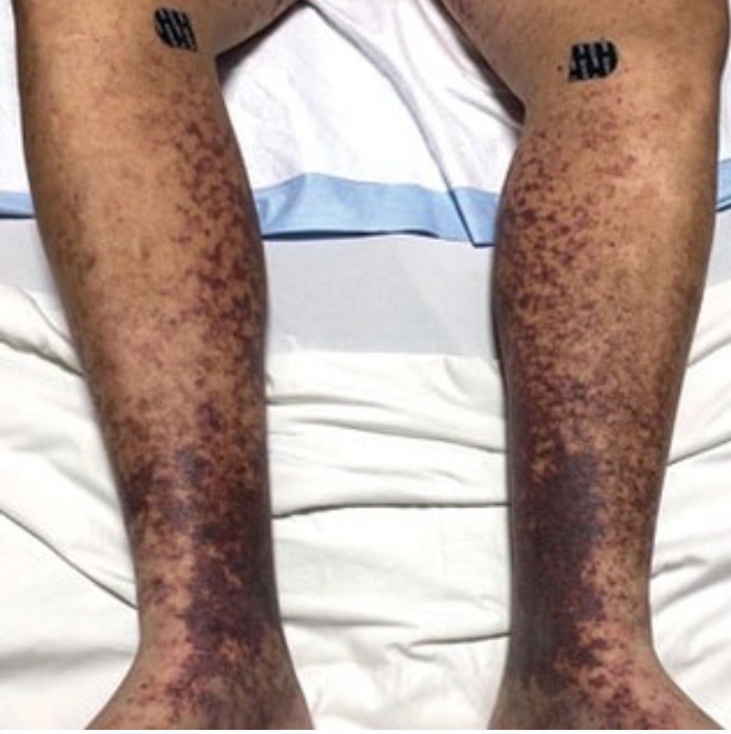 A 58-year-old man presented with a petechial and purpuric rash limited to the lower extremities. He reported that the rash had been present for months but worsened acutely over the last 3 days with new-onset dark urine, joint pain, and edema limiting his ability to walk. Physical examination showed areas of violaceous macules and papules on the legs and dorsal feet in a reticular distribution. Laboratory findings were remarkable for an elevated serum creatinine level of 2.75 mg/dL (reference range, 0.70–1.30 mg/dL), and serum immunofixation revealed the presence of markedly elevated IgG lambda monoclonal proteins. He was afebrile and his vital signs were stable. Dermatology, nephrology, and rheumatology services were consulted. What's your diagnosis? A. angioinvasive fungal infection B. antiphospholipid antibody syndrome C. calciphylaxis D. livedoid vasculopathy E. type I cryoglobulinemia