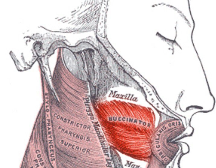 Buccinator muscle The buccinator is a thin, square-shaped muscle. It is located between the mandible and maxilla, deep to the other muscles of the face.