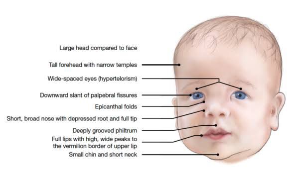 Signs and symptoms of Noonan syndrome vary greatly among individuals and may be mild to severe. Characteristics may be related to the specific gene containing the mutation. Facial features Facial appearance is one of the key clinical features that leads to a diagnosis of Noonan syndrome. These features may be more pronounced in infants and young children, but change with age. In adulthood, these distinct features become more subtle. Features may include the following: Eyes are wide-set and down-slanting with droopy lids. Irises are pale blue or green. Ears are low-set and rotated backward. Nose is depressed at the top, with a wide base and bulbous tip. Mouth has a deep groove between the nose and the mouth and wide peaks in the upper lip. The crease that runs from the edge of the nose to the corner of the mouth becomes deeply grooved with age. Teeth may be crooked, the inside roof of the mouth (palate) may be highly arched and the lower jaw may be small. Facial features may appear coarse, but appear sharper with age. The face may appear droopy and expressionless. Head may appear large with a prominent forehead and a low hairline on the back of the head. Skin may appear thin and transparent with age.