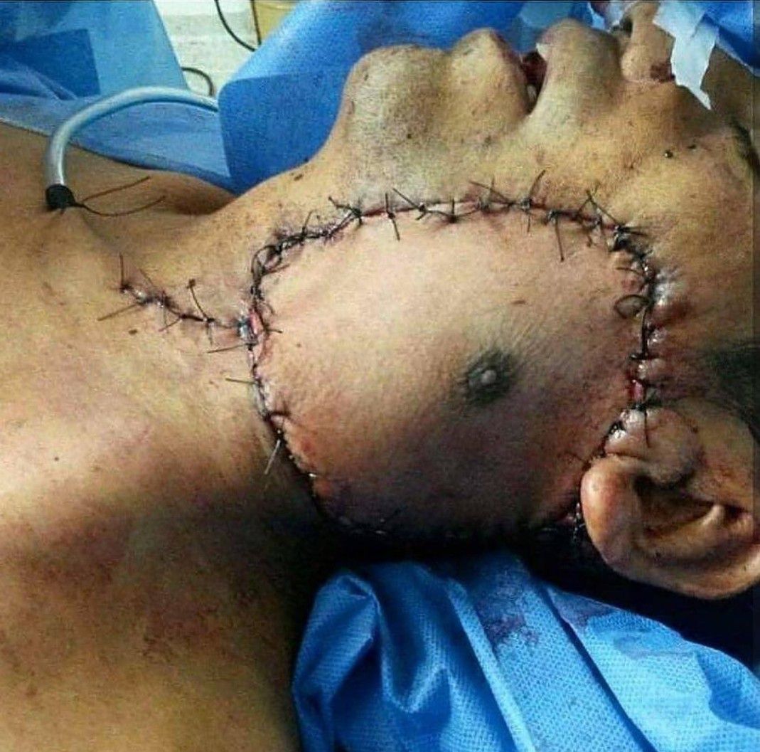 This patient suffered a traumatic injury to his face. The defect was repaired and covered with a pectoralis major myocutaneous flap. The free flap was taken from the patient’s own chest transplanted onto his face with blood supply surgically reconnected to the blood vessels adjacent to the wound. The question here is why take the flap from such a location? The term free flap is used to describe the "transplantation" of tissue from one site of the body to another, in order to reconstruct an existing defect. Various types of tissue may be transferred as a "free flap" including skin and fat, muscle, nerve, bone, cartilage (or any combination of these). For all "free flaps", the blood supply is reconstituted using microsurgical techniques to reconnect the artery (brings blood into the flap) and vein (allows blood to flow out of the flap).
