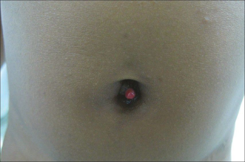 An umbilical adenoma is a patch of vitellointestinal epithelium left behind when the vitellointestinal duct closed. It may form in a deep sinus in the depths of the umbilicus, but commonly protrudes to from it like a raspberry.