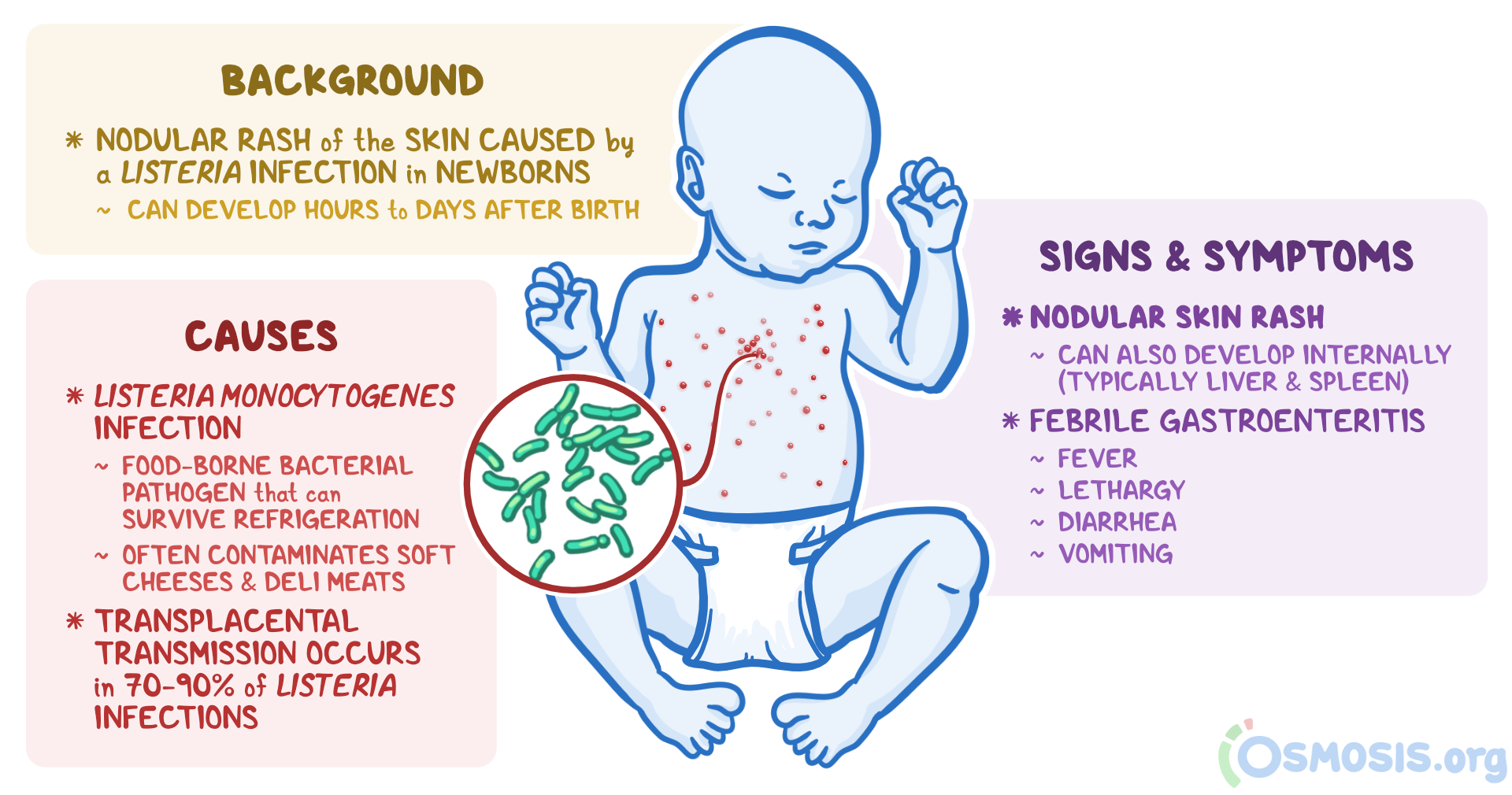 Granulomatosis infantiseptica refers to a granulomatous, or inflammatory, nodular rash of the skin caused by a Listeria infection in a newborn child. Listeria infection is an infectious disease that can develop after eating food contaminated with the Listeria monocytogenes bacteria