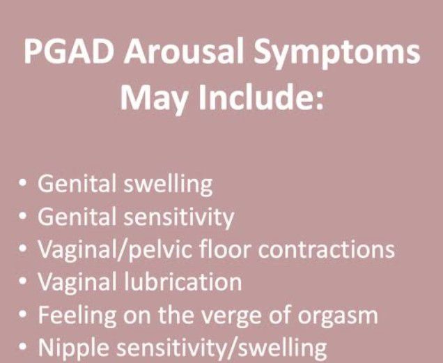 What are the symptoms of persistent genital arousal disorder? Pain or discomfort in your genitals. Tingling in your clitoris. Vaginal contractions. Vaginal lubrication. Unpredictable orgasms.
