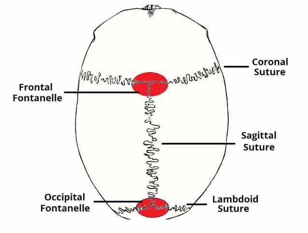 The major sutures of the skull include the following: Metopic suture. This extends from the top of the head down the middle of the forehead, toward the nose. ... Coronal suture. This extends from ear to ear. ... Sagittal suture. ... Lambdoid suture.