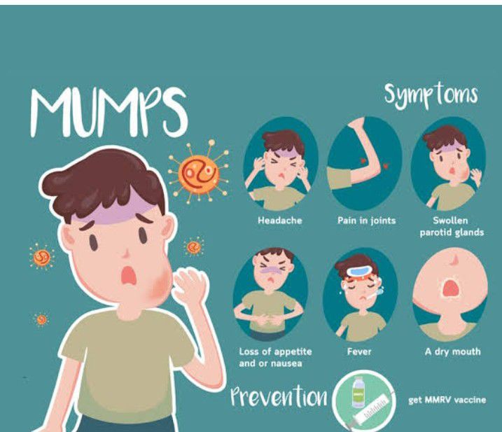 What are the symptoms of mumps? Discomfort in the salivary glands (in the front of the neck) or the parotid glands (immediately in front of the ears). Either of these glands may become swollen and tender. Difficulty chewing. Pain and tenderness of the testicles. Fever. Headache. Muscle aches. Tiredness. Loss of appetite.