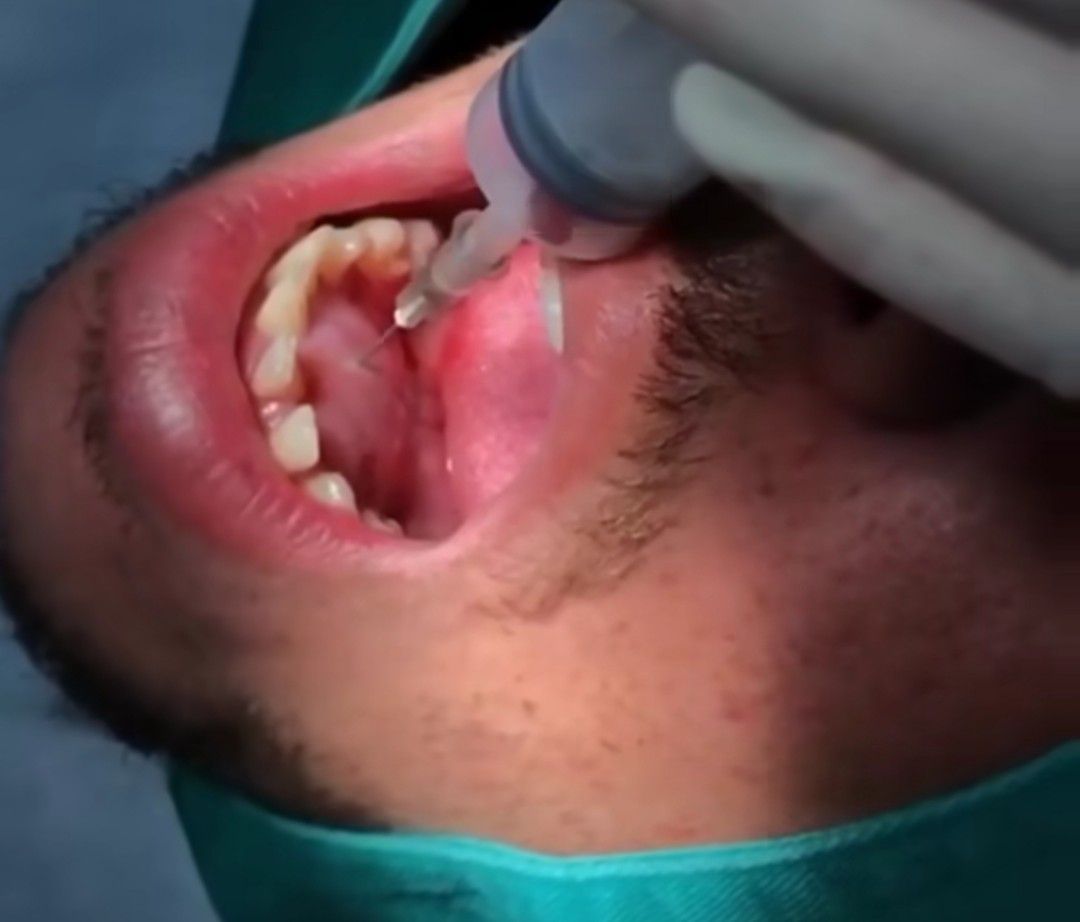 This 25 year old male patient presented with an 16 month history of an asymptomatic swelling in the anterior mandible. At this moment, we are puncturing the lesion. We can observe the emptying out (cystic fluid) and the anterior teeth moving. After an incisional biopsy the diagnostic was calcifying cystic odontogenic tumor (CCOT). This pathology also known as calcifying odontogenic cyst (COC) or Gorlin cyst is a rare developmental lesion which arises from odontogenic epithelium. Unfortunately, the next step will be the mandibular resection due to the extension of the lesion, which already affects the entire inferior border of the mandible.