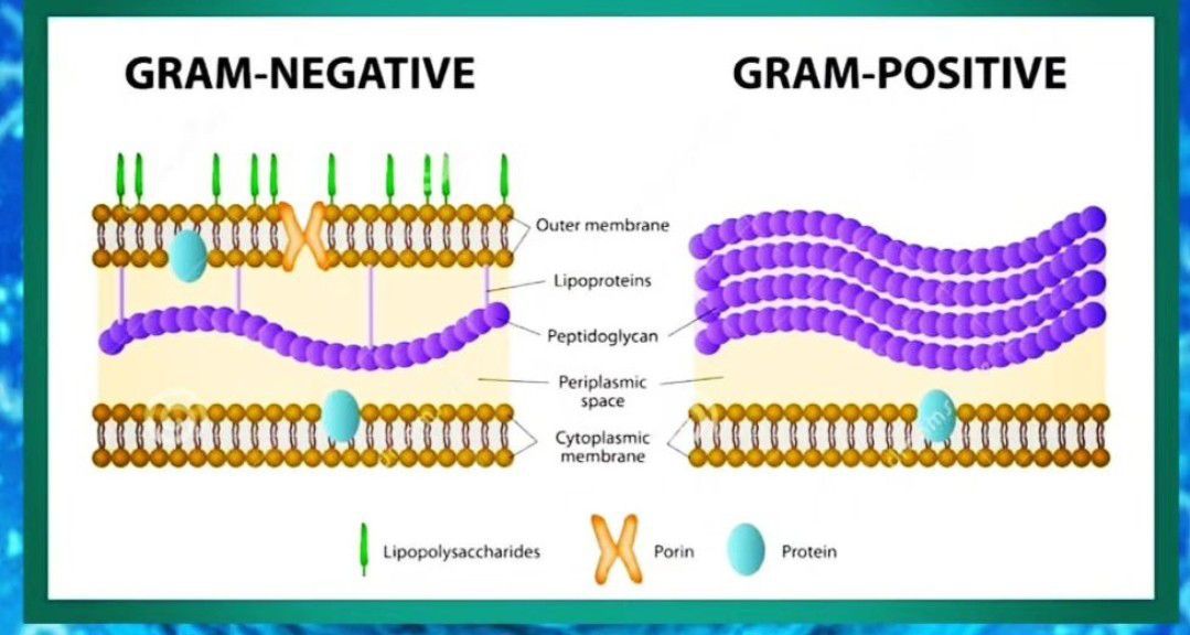 Gram-negative bacteria are surrounded by a thin peptidoglycan cell wall, which itself is surrounded by an outer membrane containing lipopolysaccharide. Gram-positive bacteria lack an outer membrane but are surrounded by layers of peptidoglycan many times thicker than is found in the Gram-negatives.