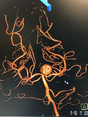 3D reconstruction of a cerebral angiogram showing a 8.5mm x 9mm aneurysm right at the bifurcation