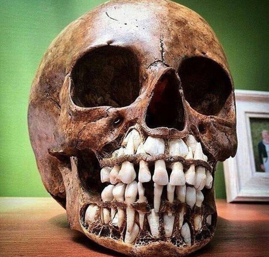 In this picture, you can see a child’s skull with a part of the jaw bone being removed to show the adult teeth developing underneath the deciduous teeth (baby teeth). The replacement of primary teeth begins around age six, when the permanent teeth start to appear in the mouth, resulting in mixed dentition. The erupting permanent teeth cause root resorption, where the permanent teeth push on the roots of the primary teeth, causing the roots to be dissolved by odontoclasts (as well as surrounding alveolar bone by osteoclasts) and become absorbed by the forming permanent teeth. The process of shedding primary teeth and their replacement by permanent teeth is called exfoliation. This may last from age six to age twelve. By age twelve there usually are only permanent teeth remaining. However, it is not extremely rare for one or more primary teeth to be retained beyond this age, sometimes well into adulthood, often because the secondary tooth fails to develop.